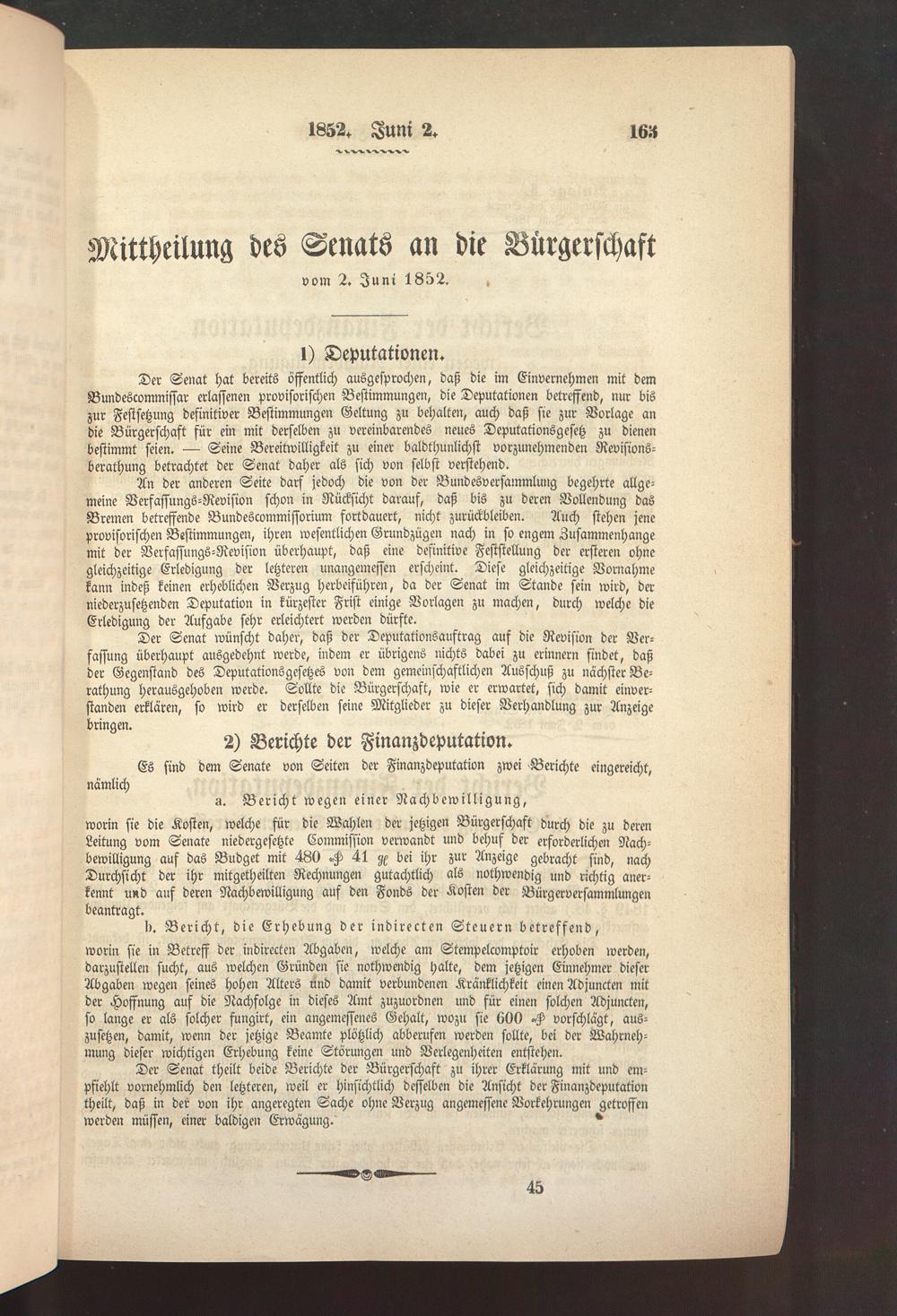 (2.6.1852) Mitteilung des Senats an die Bürgerschaft