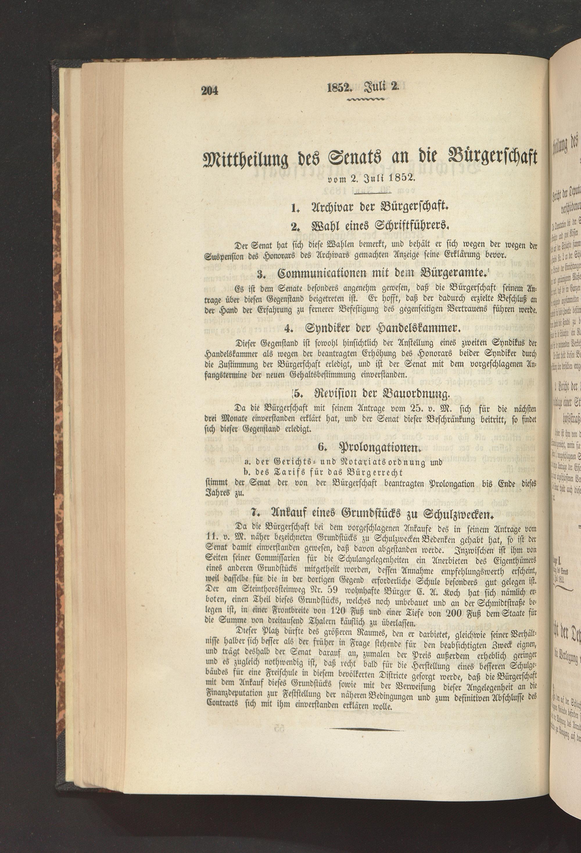 (2.7.1852) Mitteilung des Senats an die Bürgerschaft
