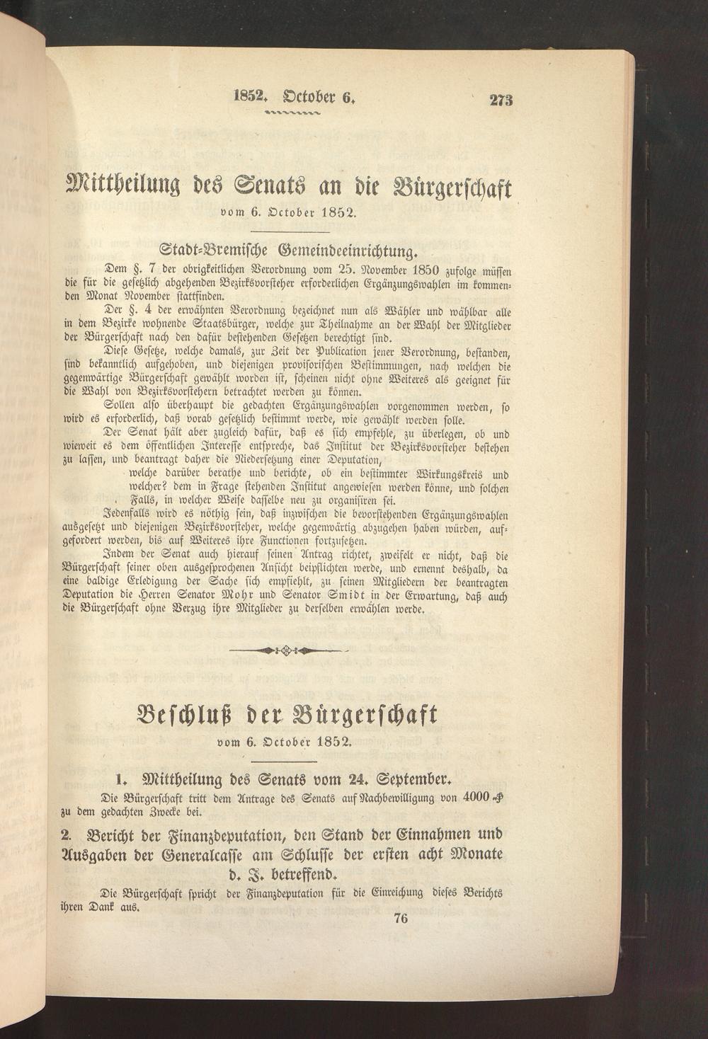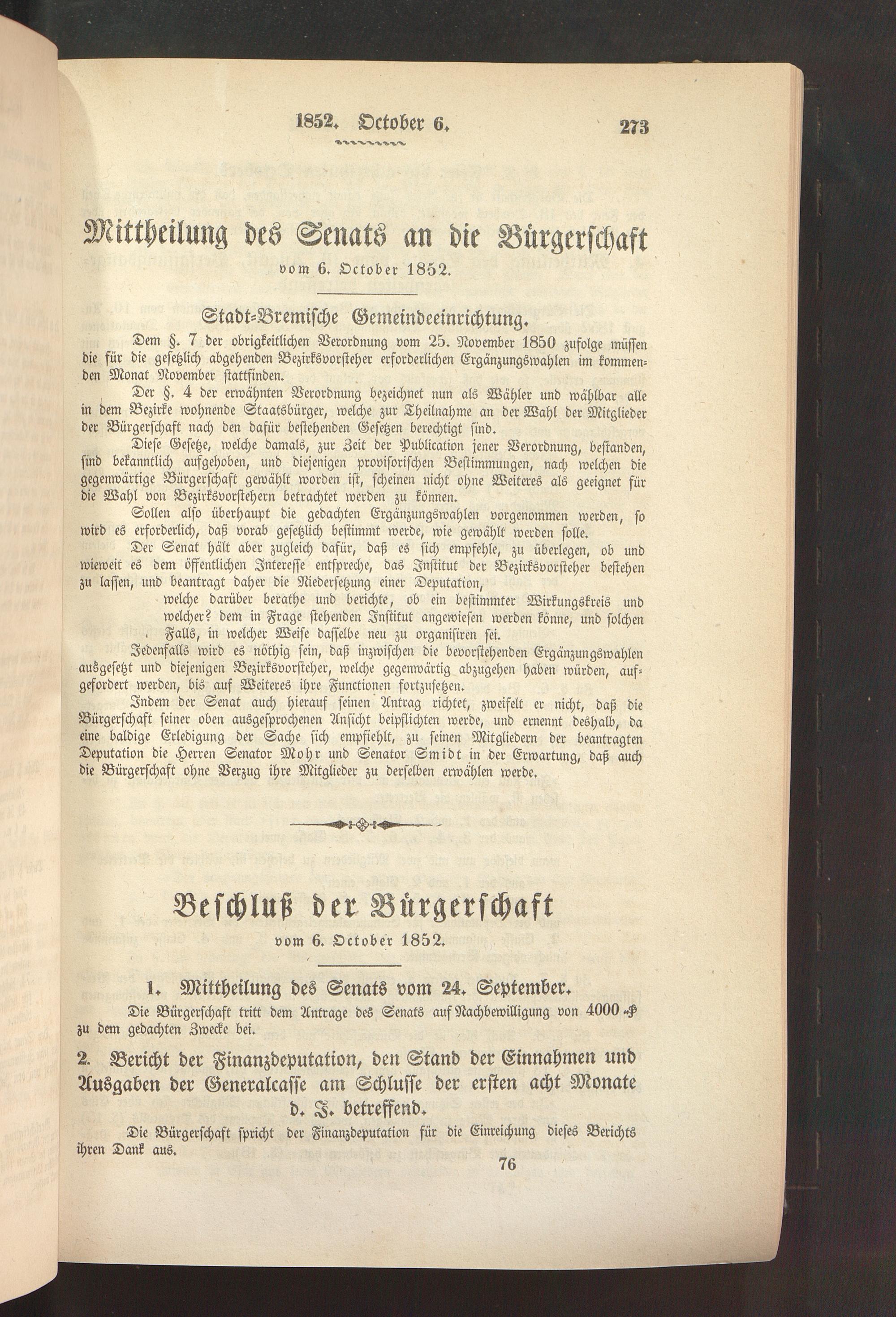(6.10.1852) Mitteilung des Senats an die Bürgerschaft