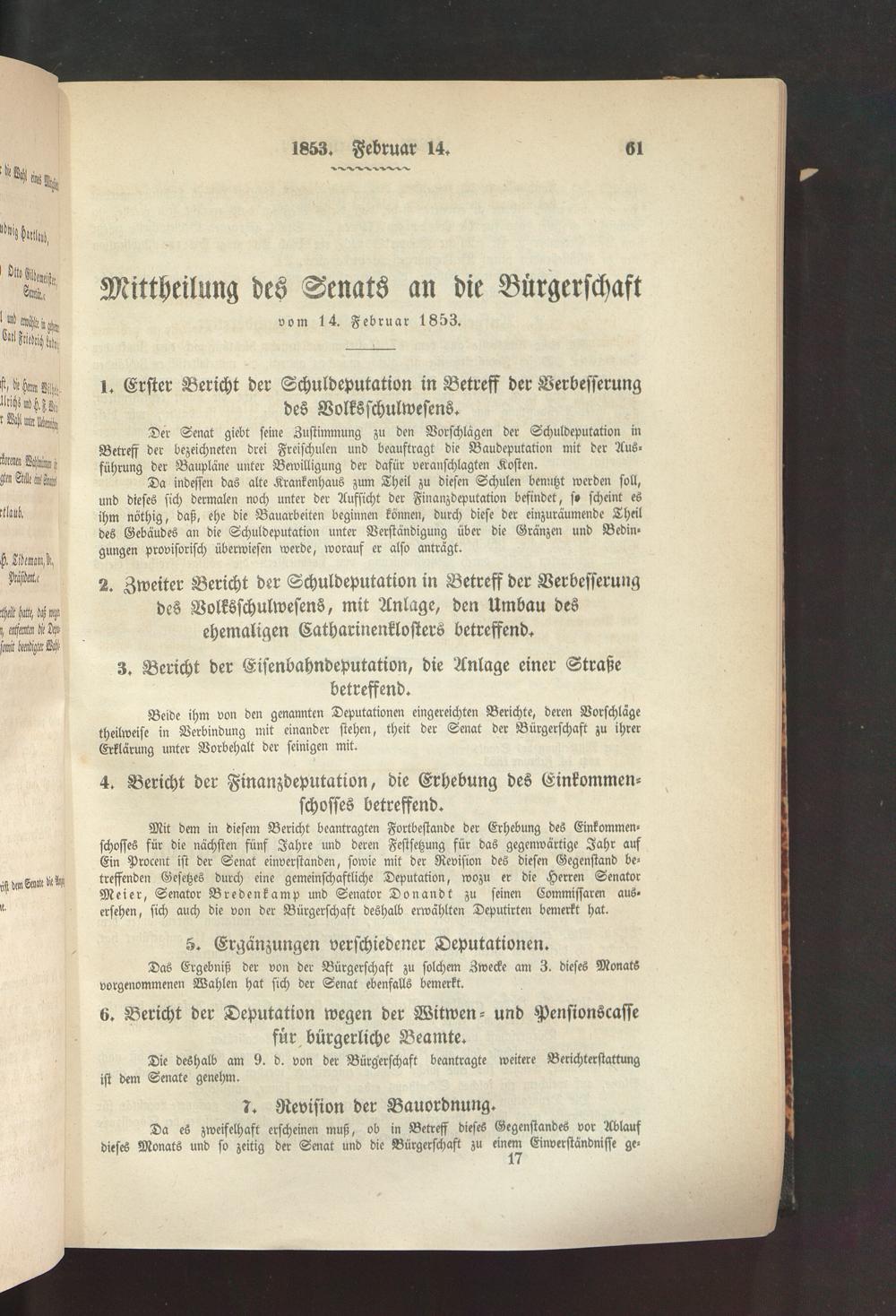 (14.2.1853) Mitteilung des Senats an die Bürgerschaft