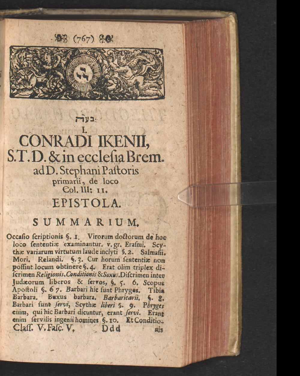 I. Conradi Ikenii, s.t.d. & in ecclesia Brem. adD. Stephani Pastoris primarii, de loco Col. III: II. Epistola. summarium.
