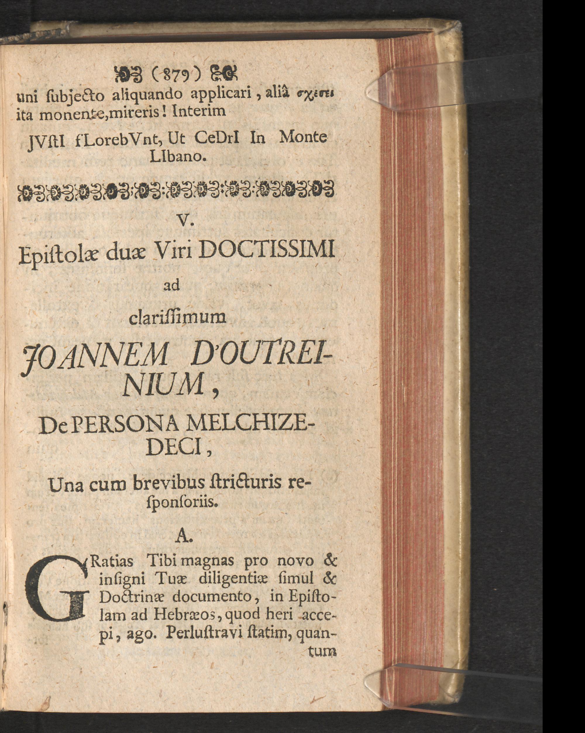 V. Epistolae duae viri doctissimi ad clarissimum Joannem d'Outreinium, De persona Melchizedeci, una cum brevibus sricturis responsoriis.