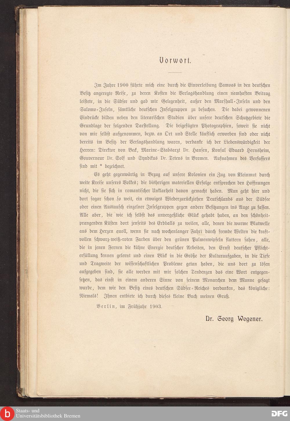 Es geht gegenwärtig in Bezug auf unsere Kolonien ein Zug von Kleinmut durch weite Kreise unseres Volkes; die bisherigen materiellen Erfolge entsprechen den Hoffnungen nicht, die sie sich in romantischer Unklarheit davon gemacht haben. Man geht hier und dort sogar schon so weit, ein etwaiges Wiederzurückziehen Deutschlands aus der Südsee oder einen Austausch einzelner Inselgruppen gegen andere Besitzungen ins Auge zu fassen. Alle aber, die wie ich selbst das unvergeßliche Glück gehabt haben, an den schönheit- prangenden Küsten dort jenseits des Erdballs zu weilen, alle, denen die warme Blutwelle aus dem Herzen quoll, wenn sie nach wochenlanger Fahrt durch fremde Welten die kraftvollen schwarz-weiß-roten Farben über den grünen Palmenwipfeln flattern sahen, alle, die in jenen Fernen die kühne Energie deutscher Arbeiten, den Ernst deutscher Pflichterfüllung kennen gelernt und einen Blick in die Größe der Kulturaufgaben, in die Tiefe und Tragweite der wissenschaftlichen Probleme getan haben, die uns dort zu lösen aufgegeben sind, sie alle werden mit mir solchen Tendenzen das eine Wort entgegensetzen, das einst in einem anderen Sinne von seinem Monarchen dem Manne gesagt wurde, dem wir den Besitz eines deutschen Südsee-Reiches verdanken, das königliche: Niemals! Ihnen entbiete ich durch dieses kleine Buch meinen Gruß.