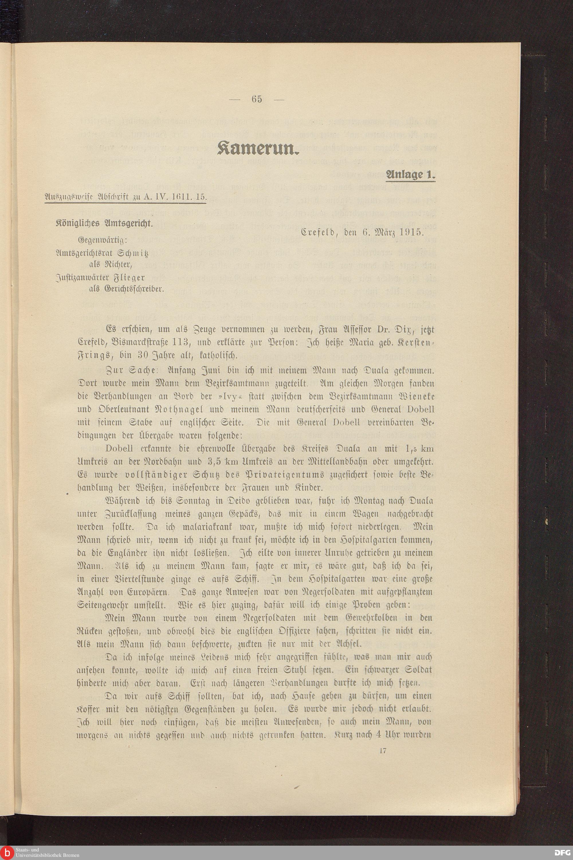 Verhalten der englischen und der unter englischem Oberbefehl stehenden französischen Truppen gegen die weiße Bevölkerung der deutschen Schutzgebiete Kamerun und Togo / Reichs-Kolonialamt