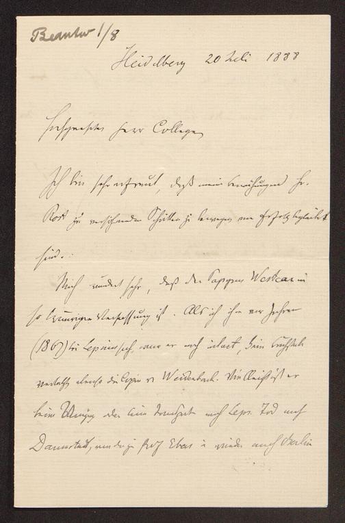 - QuellenangabeBrief von August Eisenlohr an Adolf Erman. Heidelberg, 20.07.1888. Staats- und Universitätsbibliothek Bremen, https://nbn-resolving.org/urn:nbn:de:gbv:46:1-77317 / Public Domain Mark 1.0