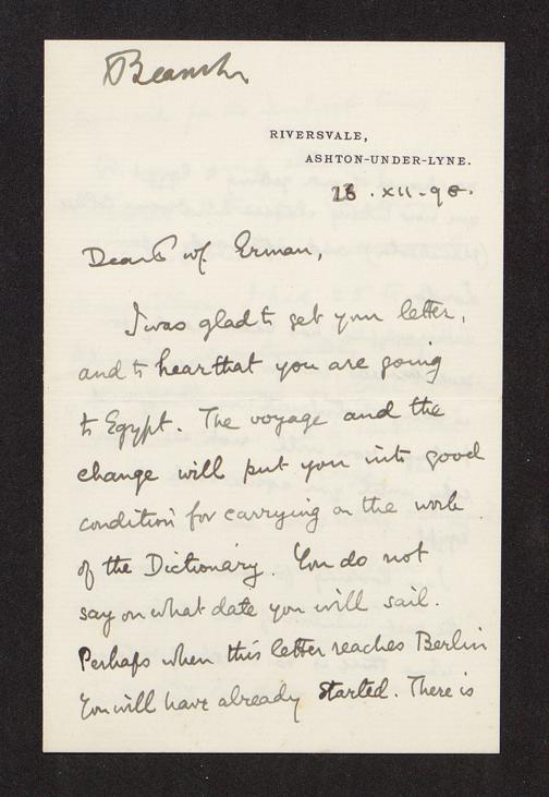 - QuellenangabeBrief von Francis Ll. Griffith an Adolf Erman. Ashton-under-Lyne, 23.12.1898. Staats- und Universitätsbibliothek Bremen, https://nbn-resolving.org/urn:nbn:de:gbv:46:1-81770 / Public Domain Mark 1.0