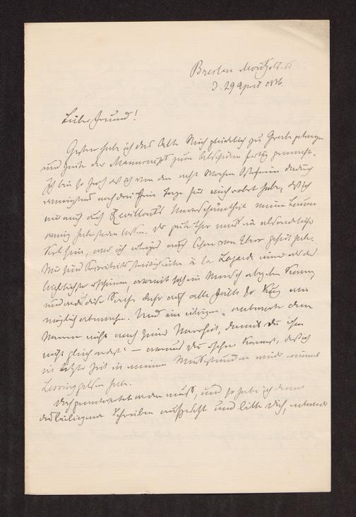 - QuellenangabeBrief von Eduard Meyer an Adolf Erman. Breslau, 29.04.1886. Staats- und Universitätsbibliothek Bremen, https://nbn-resolving.org/urn:nbn:de:gbv:46:1-93191 / Public Domain Mark 1.0