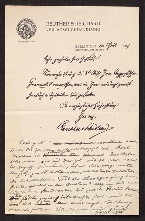 - QuellenangabeBrief von Reuther & Reichard (Berlin) an Adolf Erman. Berlin, 10.04.1917. Staats- und Universitätsbibliothek Bremen, https://nbn-resolving.org/urn:nbn:de:gbv:46:1-98520 / Public Domain Mark 1.0