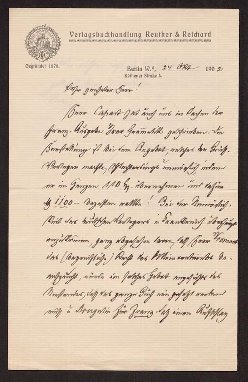 - QuellenangabeBrief von Reuther & Reichard (Berlin) an Adolf Erman. Berlin, 24.10.1902. Staats- und Universitätsbibliothek Bremen, https://nbn-resolving.org/urn:nbn:de:gbv:46:1-98551 / Public Domain Mark 1.0