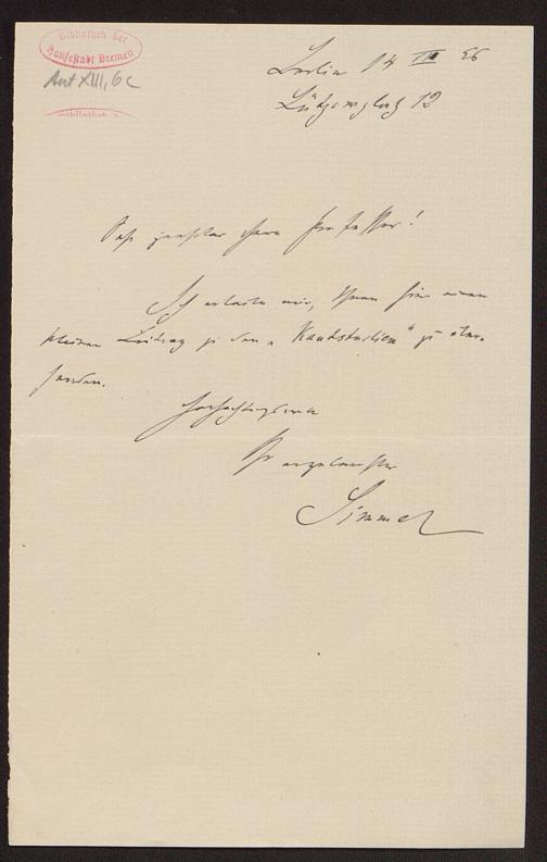 - ReferenceBrief von Georg Simmel an Hans Vaihinger, 14.08.1896. Berlin, 14.08.1896. Staats- und Universitätsbibliothek Bremen, Aut.XXIII,6., https://nbn-resolving.org/urn:nbn:de:gbv:46:1-170417 / Public Domain Mark 1.0
