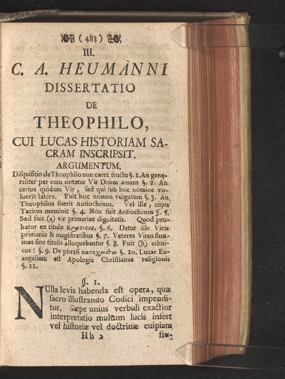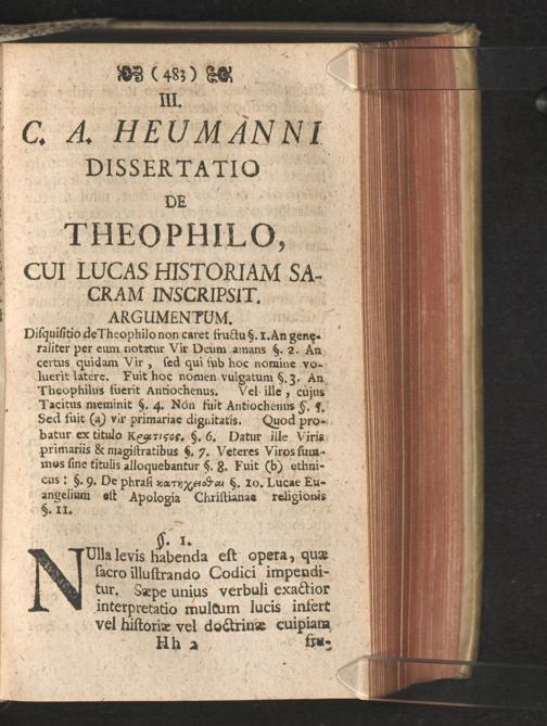 III. C.A. Heumanni dissertatio de Theophilo, cui Lucas historiam sacram inscripsit. Argumentum.